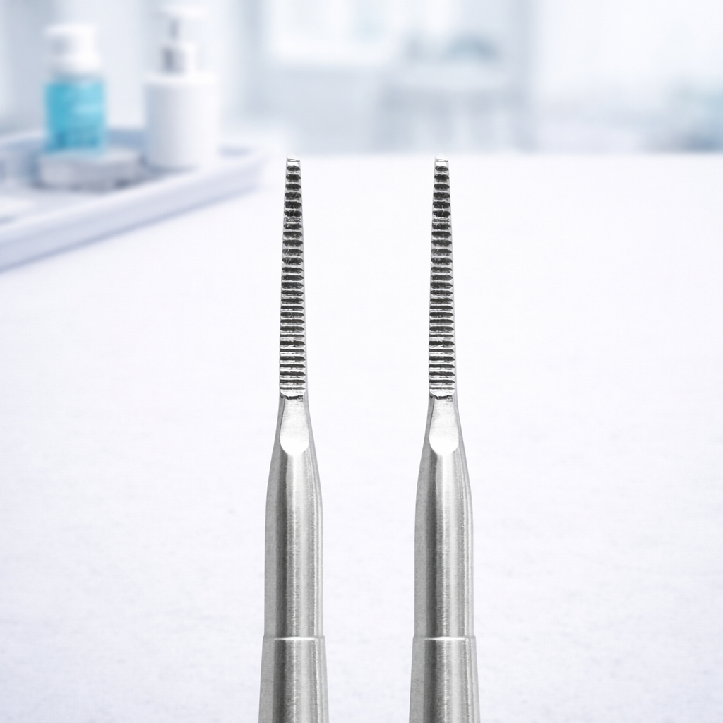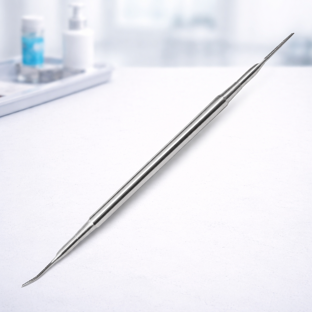 Το Professional Stainless Steel Double-Tipped Instrument with Fine Microfile αποτελεί εργαλείο υψηλής ακρίβειας για επαγγελματική χρήση στην ποδολογία και το ιατρικό πεντικιούρ. Κατασκευασμένο από ανοξείδωτο χειρουργικό ατσάλι, προσφέρει εξαιρετική αντοχή, υγιεινή και δυνατότητα πλήρους αποστείρωσης.