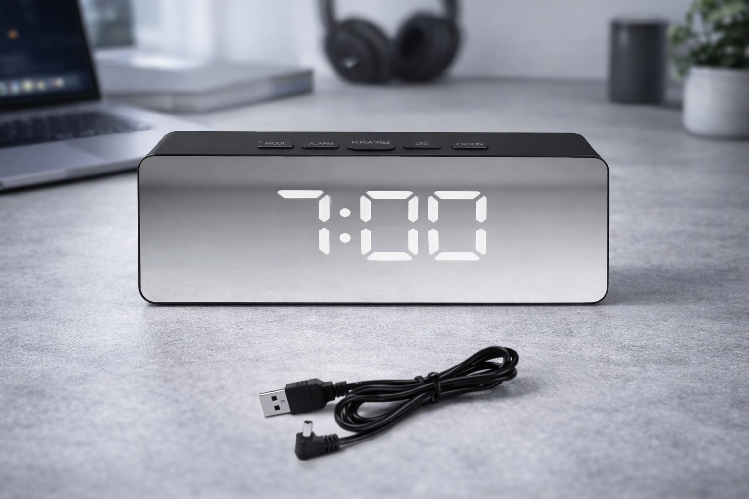 Κομψό επιτραπέζιο ψηφιακό ρολόι με καθρέφτη πρόσοψη, ιδανικό για υπνοδωμάτιο, γραφείο ή επαγγελματικό χώρο. Διαθέτει φωτεινή LED ένδειξη ώρας με μοντέρνο σχεδιασμό, λειτουργία ξυπνητηριού και πρακτικά πλήκτρα ελέγχου στο επάνω μέρος.
