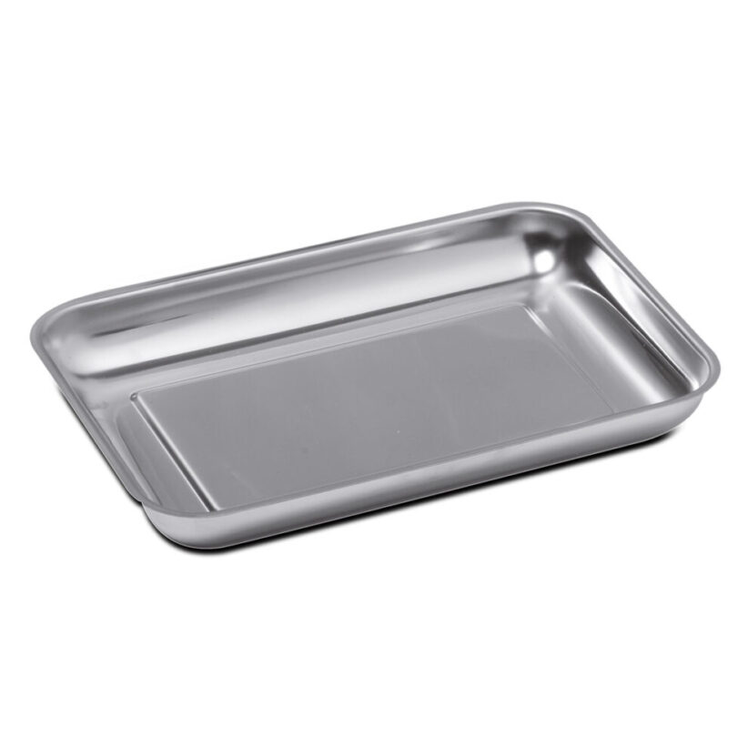 Ορθογώνιος δίσκος εργαλείων από ανοξείδωτο ατσάλι. Ιδανικός για αποθήκευση & αποστείρωση εργαλείων. Μέγεθος Small – 26x18x3 cm. Κατάλληλος για autoclave.