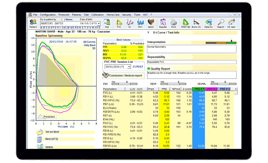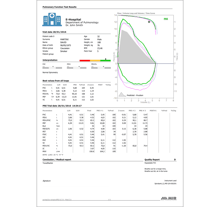 Σπιρόμετρο MIR Minispir Σπιρομέτρηση για πλήρη αναπνευστική ανάλυση με χρήση υπολογιστή. Συνδέεται απ’ ευθείας στη θύρα USB του υπολογιστή σας και συνεργάζεται με το πανίσχυρο λογισμικό MIR SPIRO PLATINUM®. Το λογισμικό MIR SPIRO PLATINUM® παρέχει σε πραγματικό χρόνο καμπύλες Ροής / Όγκου και Όγκου / Χρόνου με προ & μετά βρογχοδιαστολή με παράλληλη σύγκριση με ένα ευρύ φάσμα επιλέξιμων παραμέτρων στον υπολογιστή σας. Περιλαμβάνει δωρεάν online ενημερώσεις. ΝΕΟ ΠΑΝΙΣΧΥΡΟ ΛΟΓΙΣΜΙΚΟ MIR SPIRO PLATINUM®Το εξελιγμένο λογισμικό MIR SPIRO PLATINUM® που συνοδεύει την συσκευή παρέχει σε πραγματικό χρόνο καμπύλες Ροής / Όγκου και Όγκου / Χρόνου προ & μετά βρογχοδιαστολής με παράλληλη σύγκριση από ένα ευρύ φάσμα επιλέξιμων παραμέτρων στον υπολογιστή σας. Εύχρηστο και πλήρως παραμετροποιήσιμο, το νέο λογισμικό είναι σύμφωνο με τις τελευταίες οδηγίες ATS 2019, εμφανίζει το LLN (Lower Limit of Normal), το zscore και γραφήματα Pre & Post Score για τις FVC, FEV1 και FEV1/FVC. Διαθέτει όλα τα σετ προβλεπόμενων τιμών και επιτρέπει στον χρήστη να επιλέξει ως αναφορά εκτός του κύριου συγγραφέα, δευτερεύοντες συγγραφείς από μια λίστα 18 επιλογών, συμπεριλαμβανομένων του GLI, Nhanes, ERS, Knudson και άλλων. Από την ημερομηνία ενεργοποίησης και για 1 έτος πραγματοποιούνται δωρεάν όλες οι online ενημερώσεις και υποστήριξη από τον κατασκευαστή. Το σπιρόμετρο MIR Minispir είναι ευέλικτο στη λειτουργία του καθώς μπορεί να λειτουργήσει τόσο με αισθητήρες ροής πολλαπλών χρήσεων όσο και με αισθητήρες ροής (τουρμπίνες) μιας χρήσης FlowMir® με ενσωματωμένο επιστόμιο και ιδιαίτερα χαμηλό κόστος. Ο αισθητήρας ροής πολλαπλών χρήσεων είναι αποσπώμενος με δυνατότητα αποστείρωσης. Δεν απαιτείται βαθμονόμηση καθώς αμφότεροι οι αισθητήρες είναι καλιμπραρισμένοι. Ιδανικό για εξετάσεις ρουτίνας με άμεση και ακριβή διάγνωση.Διαθέτει Παιδιατρικό μενού κινούμενων σχεδίων για ενθάρρυνση των μικρών ασθενών.Εμφανίζει την εκτίμηση της «ηλικίας»/κατάστασης των πνευμόνων (ELA).Εκτελεί σπιρομέτρηση με δοκιμασία πρόκλησης μεταχολίνης.Διαθέτει ενσωματωμένο αισθητήρα θερμοκρασίας και ως εκ τούτου δεν απαιτείται οποιαδήποτε ρύθμιση.Συνοδεύεται από τσάντα μεταφοράς. Τεχνικά Χαρακτηριστικά Σπιρομέτρου Αισθητήρας θερμοκρασίας: Ημιαγωγός (0-45 ° C) Ροή : ± 16 L / s Aκρίβεια Ροής : ± 5% ή 200 mL / s Αισθητήρας ροής: Ψηφιακή Τουρμπίνα διπλής ροής Εύρος ροής: ± 16 L/s Ακρίβεια όγκου: ± 3% ή 50 mL Δυναμική αντίσταση στα 12 L/s: