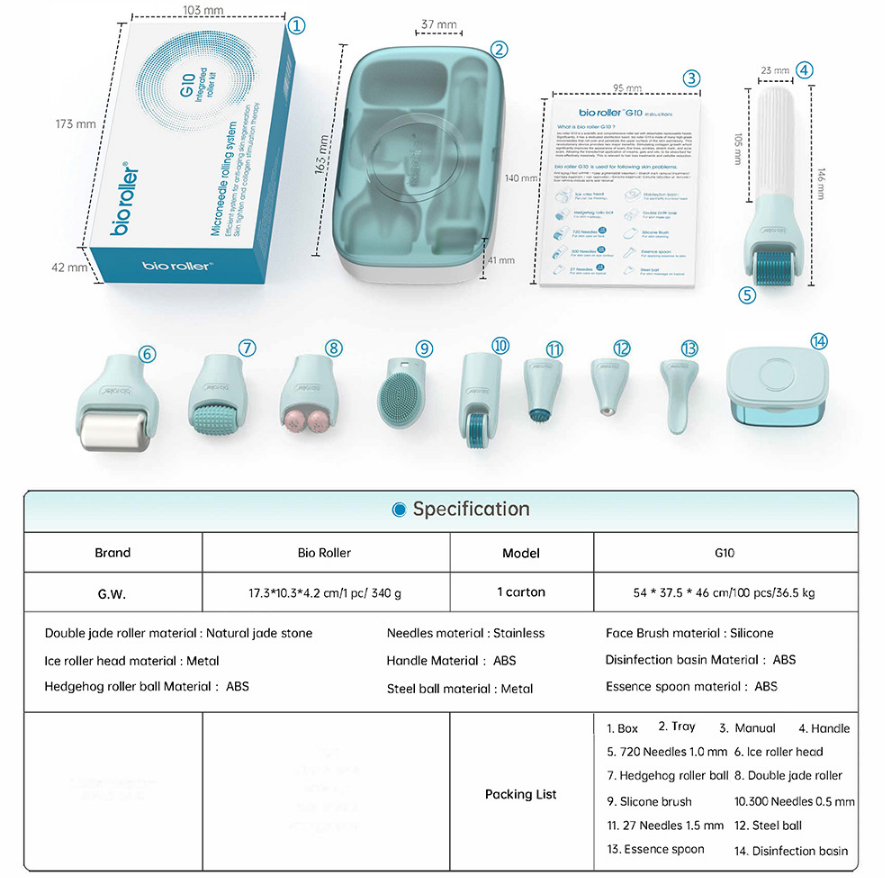Συσκευή Μεσοθεραπείας Dr.Pen Bio Roller G10 H συσκευή μεσοθεραπείας Bio Roller G10 είναι μια νέα συσκευή φροντίδας του δέρματος. Χρησιμοποιείται για να διεγείρει την παραγωγή κολλαγόνου και να αυξάνει την απορρόφηση των προϊόντων περιποίησης της επιδερμίδας. H συσκευή μεσοθεραπείας Bio Roller G10 χρησιμοποιείται για τη βελτίωση της εμφάνισης του δέρματος και τη μείωση των σημείων γήρανσης. Προορίζεται για την αντιμετώπιση των ουλών ακμής, την τριχόπτωση και την υπερμελάγχρωση. Με 9 εναλλάξιμες κεφαλές σύνδεσης και 1 λεκάνη απολύμανσης, η συσκευή μεσοθεραπείας Bio Roller G10 είναι η πύλη σας για την επίτευξη διαχρονικής ομορφιάς. Εφαρμογές για το Bio Roller G10: 1. Αντιγήρανση, καταπολέμηση των ρυτίδων2. Αφαίρεση ραγάδων3. Αφαίρεση ουλών4. Μείωση της κυτταρίτιδας5. Θεραπεία κατά της τριχόπτωσης6. Θεραπεία κατά της υπερμελάγχρωσης